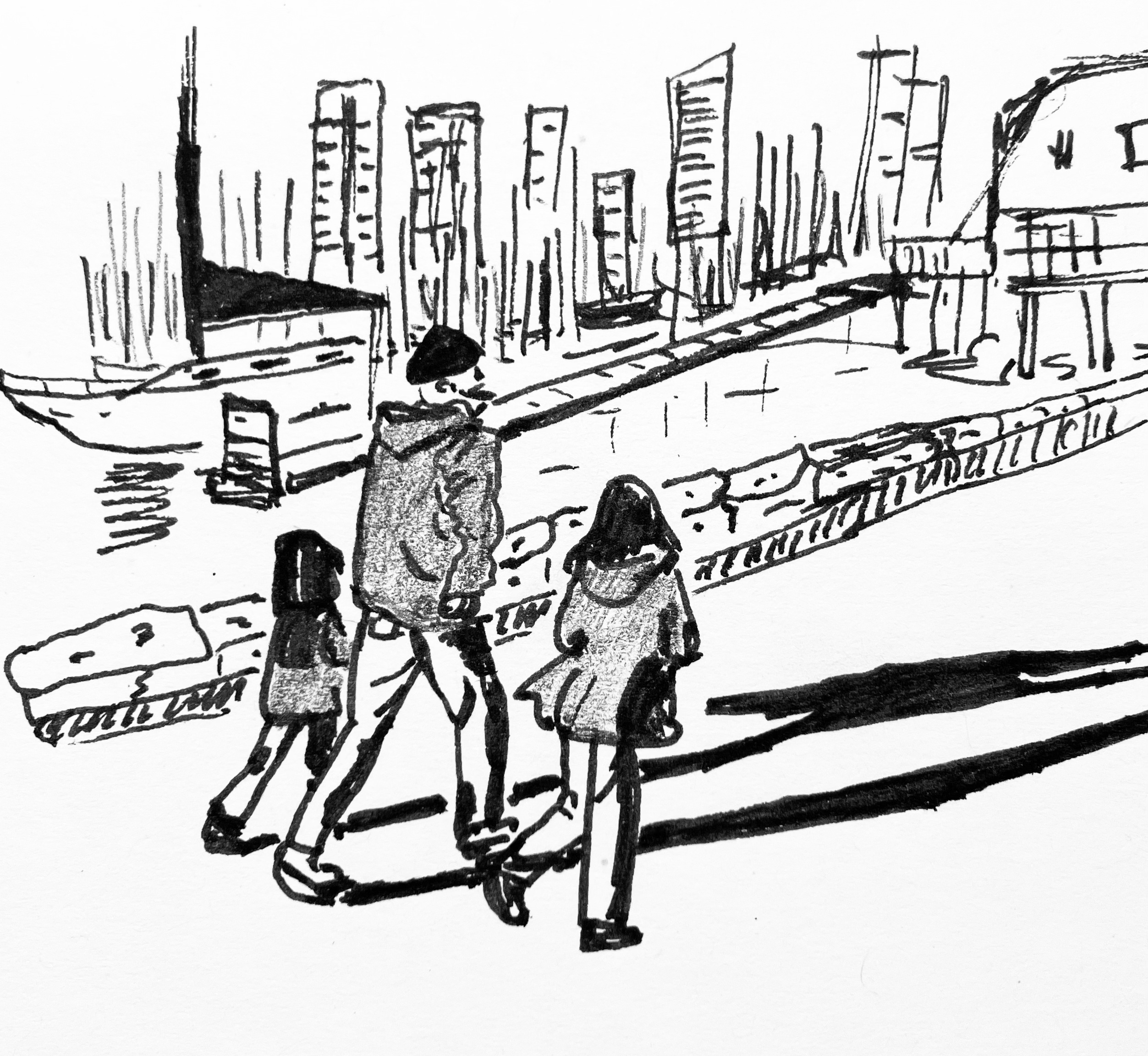 A man walking with his children in the False Creek neighbourhood, Vancouver.