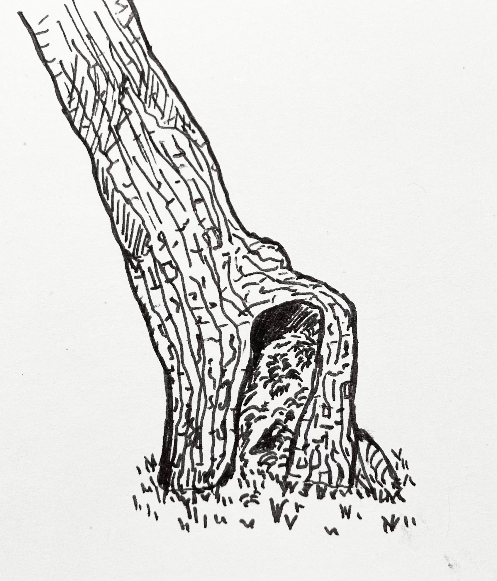 An unusual tree with a hollowed out base of the trunk where new shoots are taking root.